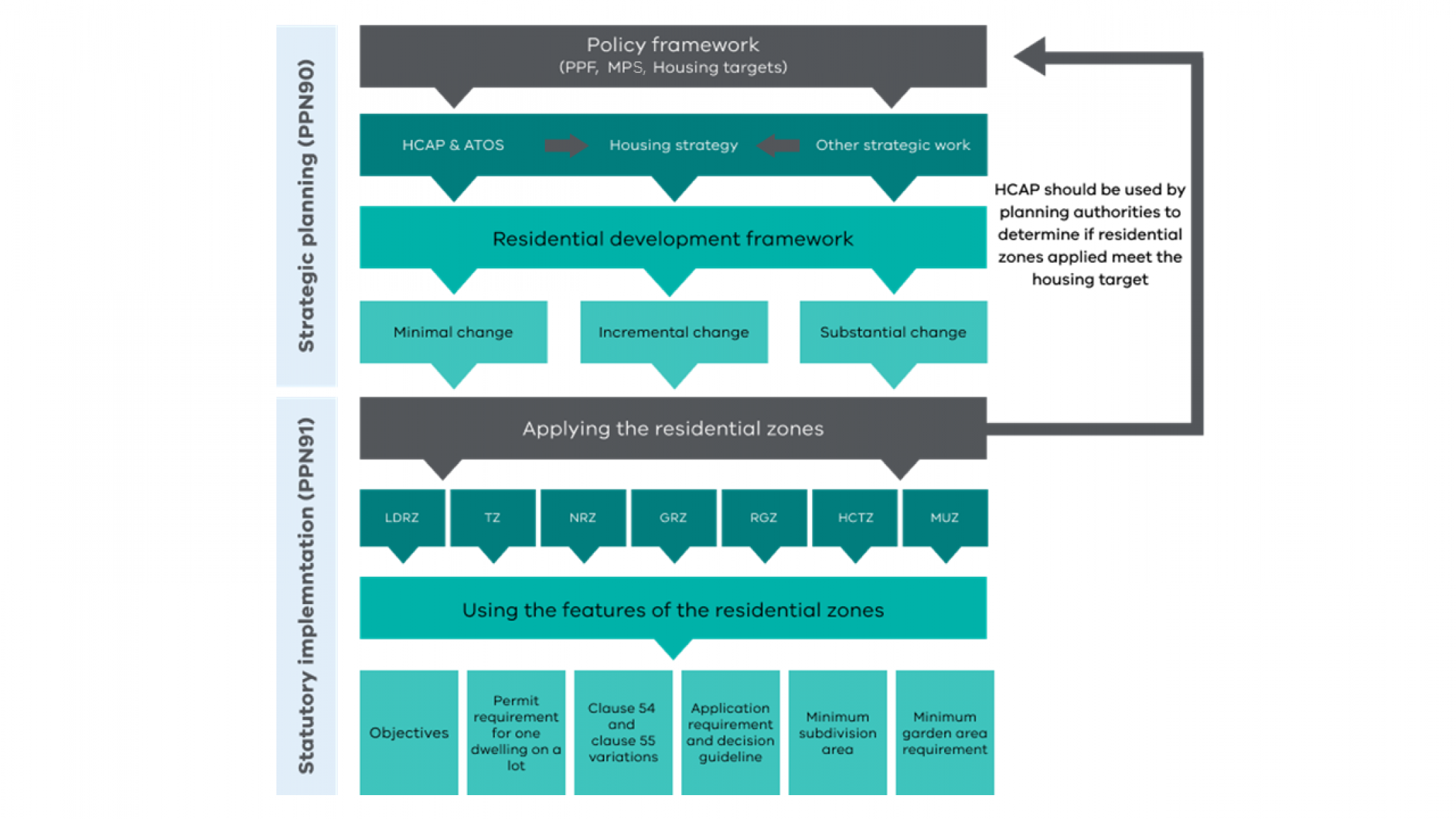 Residential zones must implement the municipal-wide residential development framework plan, a Municipal Planning Strategy (MPS). The MPS should be developed in response to relevant state and regional planning policies in the Planning Policy Framework (PPF).
